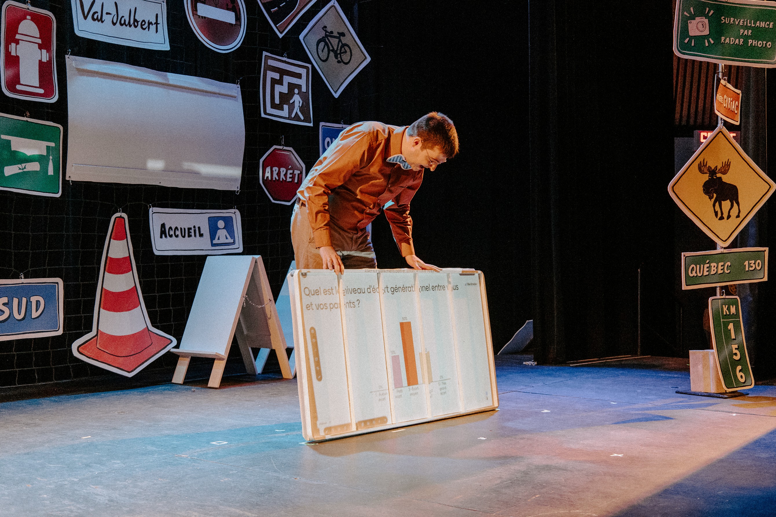 Dans un spectacle interactif où le spectateur a un rôle à jouer, la pièce trace avec humour la frontière poreuse entre qui nous sommes et l’endroit d’où nous venons.